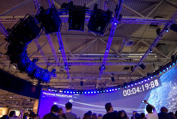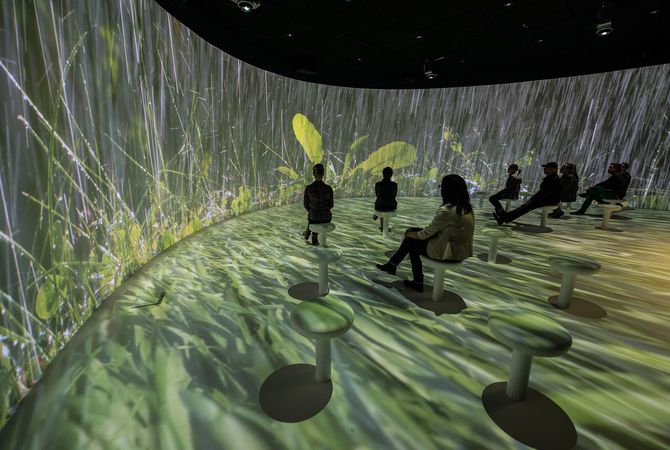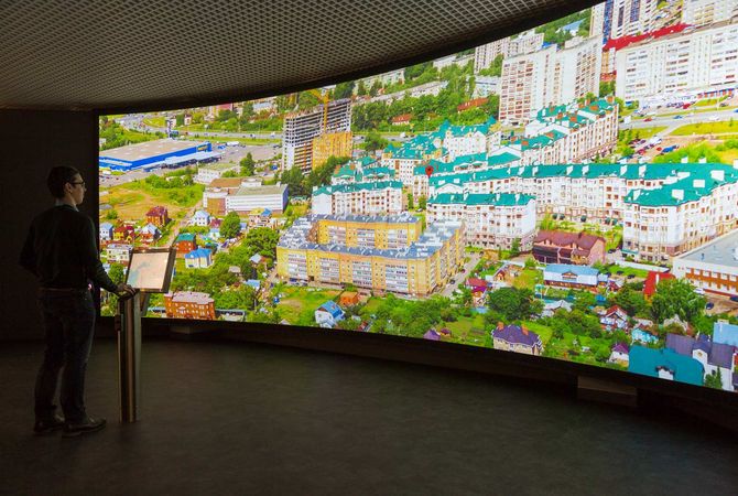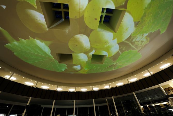 The visitors to the Canon Perspective at the Gasometer in Vienna find themselves surrounded by a circular screen. 8 Canon WUX4000 projectors project onto a 220m² projection surface.