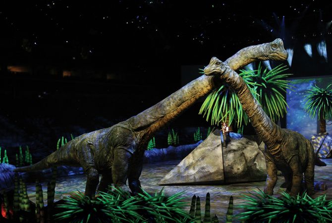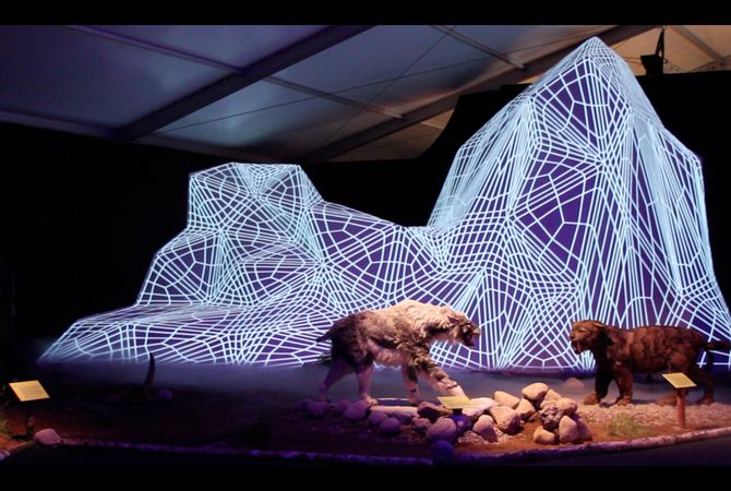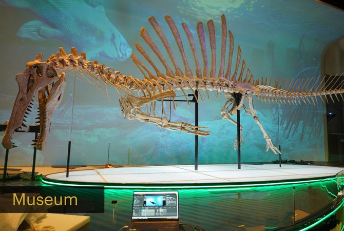 The backdrop of a Spinosaurus skeleton has been brought to life using a complex array of projectors, all powered by AV Stumpfl’s PIXERA two QUAD media servers.