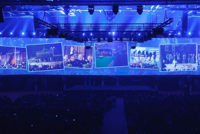 2500 invited guests are sitting in the Nuremberg Frankenhalle surrounded by an enormous 125 m wide U-shaped projection when the journey through time begins. Faber-Castell can look back on a company history spanning 250 years.