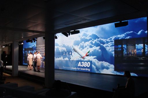 The delivery of the first A380 to the arabian airline Emirates was celebrated by Airbus with a 20x4 m big panorama projection with softedge technology.