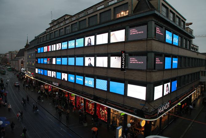Basle has never seen anything like it! From December 1st until December 24th the creative minds of the Janus advertising agency are projecting high quality content and interactive components onto 51 3x2 metre displays on the façade of Manor…
